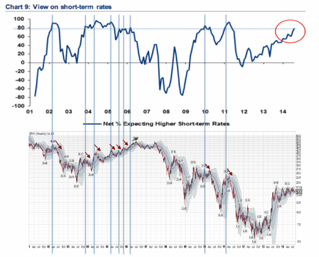 La scommessa che i tassi d’interesse iniziano ad aumentare è ancora generalizzata. Ad Agosto il 78% dei gestori ha dichiarato che si aspetta un aumento dei tassi d’interesse nei prossimi mesi, la percentuale più elevata dal maggio 2011.