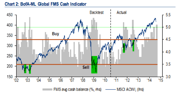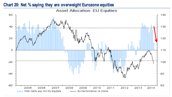 All’inizio di Luglio i gestori che erano sovrappesati sull’azionario erano il 61%, il secondo picco più elevato dall’inizio del sondaggio nel 2001. Questo eccesso di ottimismo identificò un chiaro rischio per i mercati azionari, con gli europei che subirono in ribasso nelle settimane successive dell’8% mentre l’S&P 500 del 5%.