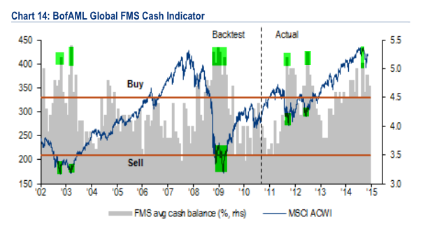 L’attuale livello di liquidità si può considerare neutrale, ancora lontano dai livelli pericolosi che anticipano la fine di un rialzo, anzi siamo molto vicini a quota 5% che rappresenta un livello di pessimismo tra i gestori.