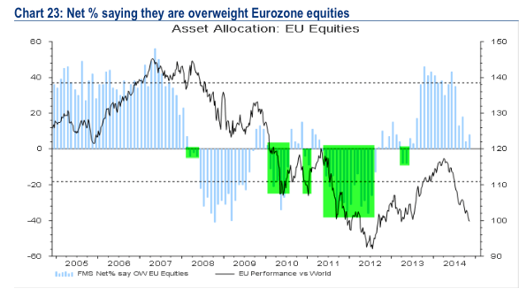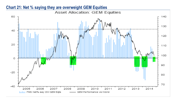 Sul Giappone ora i gestori di fondi hanno la loro maggior esposizione dall’aprile 2006, +45% dalla media storica. Nel dicembre 2012, quando iniziò il rialzo, i gestori erano al -20% di sottopeso. Anche in questo caso il rischio è che le azioni del sol levante possano iniziare a sottoperformare.