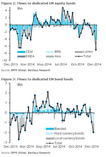 Il suo rafforzamento, oltre a sviluppare tendenze deflazionistiche interne, da qui il calo dei tassi d’interesse Usa a lungo termine e il conseguente rally di tutti i titoli governativi dei paesi sviluppati, ha provocato il forte ribasso del petrolio e quello delle valute dei paesi emergenti produttori (Rublo e Real Brasiliano). Il ribasso delle valute emergenti contro Dollaro ha accelerato l’uscita di capitali dai mercati emergenti, a parte Cina e India, con riscatti record sui fondi obbligazionari e azionari. Anche perchè negli ultimi anni la maggior parte dei paesi emergenti hanno emesso bond in dollari a livelli record, beneficiando della liquidità immessa dalla Federal Reserve dal 2009.