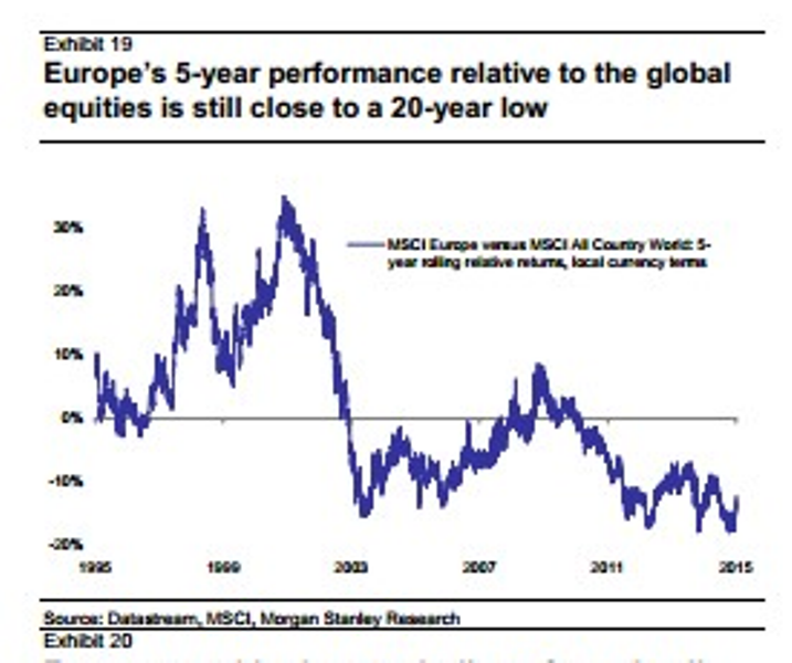 Il mercato azionario Europeo, non solo quello dell’Area Euro, ha sotto-performato per un lungo periodo rispetto a quello globale. Il rapporto tra la performance a 5 anni del Msci Europe rispetto al Msci All Country World alla fine del 2014 aveva raggiunto i minimi degli ultimi 20 anni.