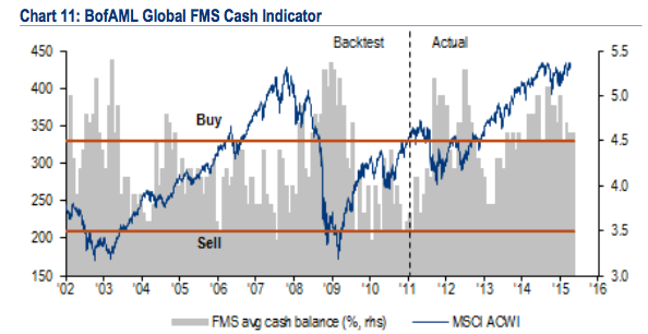 E’ risaputo che gli indicatori di “sentiment” spesso si dimostrano anticipatori “contrarian” dell’evoluzione dei mercati finanziari, come nel caso della quota di liquidità (cash) presente nei portafogli dei gestori di fondi, di cui il grafico seguente.