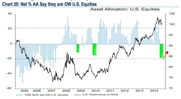 Il triplo minimo della forza relativa dei mercati emergenti vs azioni globali (grafico nero) sarà sufficiente ad invertire il trend di sfiducia dei gestori iniziato nel 2011?