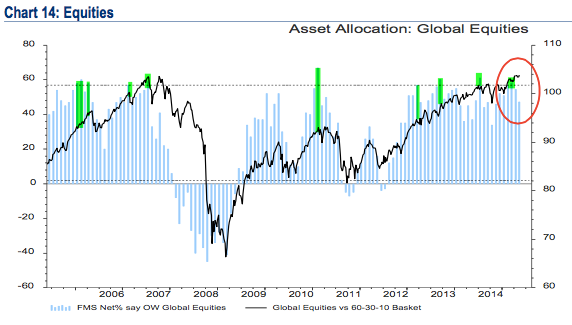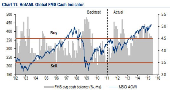 Qualcosa però è cambiato dal 2013. Da allora i gestori di fondi hanno mantenuto un approccio “risk on” nei loro portafogli, ma nello stesso tempo hanno continuato a detenere quote rilevanti di liquidità (grafico grigio invertito) mantenendosi lontani da quei livelli minimi (3,7%) che indicherebbe un elevato ottimismo.