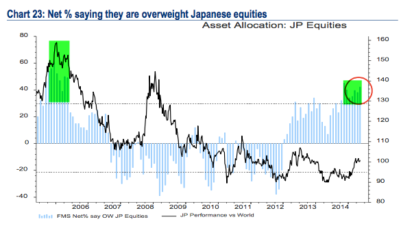 Per il 7° mese consecutivo, non succedeva dall’aprile 2006, i gestori di fondi confermano di prefererire anche le azioni giapponesi con un +42% di sovrappeso, evidentemente sono convinti che il Giappone benefici della liquidità creata dalla banca centrale.