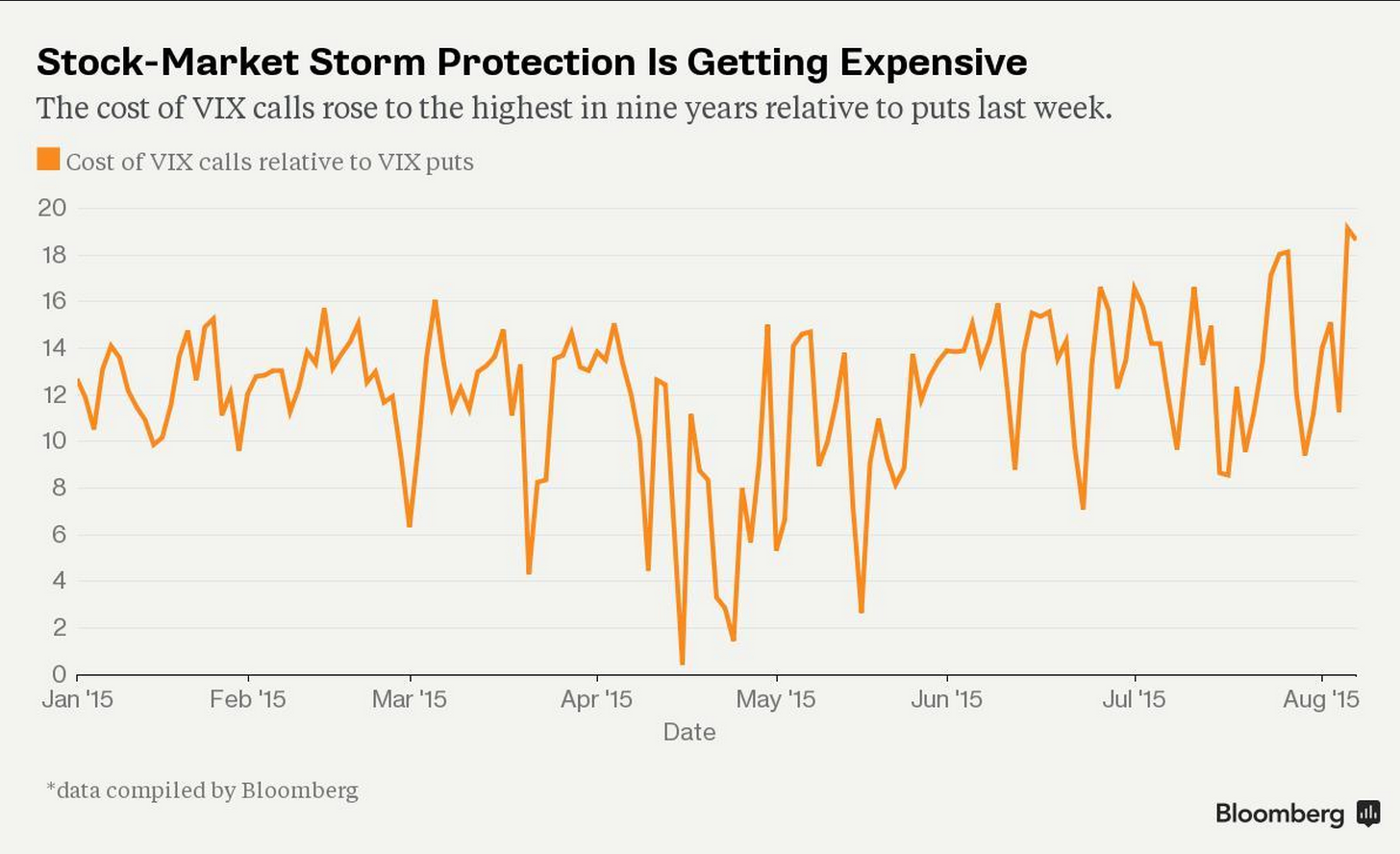 Bloomberg segnala che il costo delle opzioni call sul Vix, l’indice che rappresenta la volatilità delle opzioni “at the money” sull’S&P500 , ha raggiunto il livello più elevato dal 2006. In sostanza chi acquista opzioni call specula su di un rialzo del Vix, auspicandosi quindi un ribasso del mercato azionario.