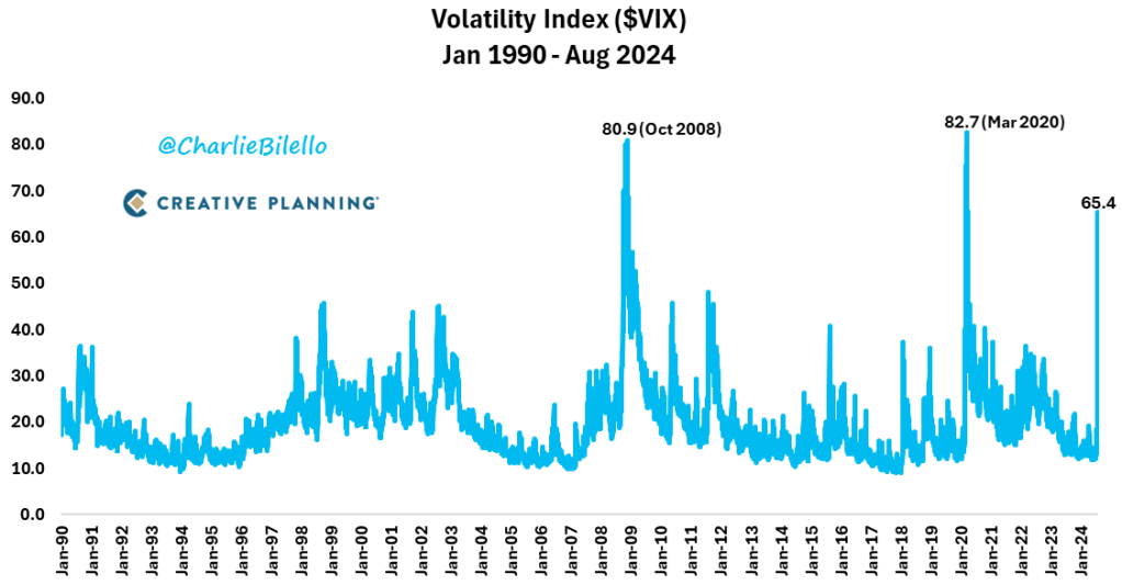 Il Vix, che misura la volatilità implicita sulle opzioni dell’S&P 500 quota ora a 65, in rialzo dalla chiusura di venerdi a 23. Se mantenuto in apertura è il suo maggior rialzo giornaliero nella storia e uno dei maggiori di sempre. Le uniche volte con una volatilità superiore: Ottobre/Novembre 2008 e Marzo 2020. – The VIX is at 65 right now, up from 23 at Friday’s close. If that were to hold it would be the biggest 1-day % increase in history and one of the highest closes ever. Only periods with higher levels of implied volatility: October/November 2008 and March 2020.