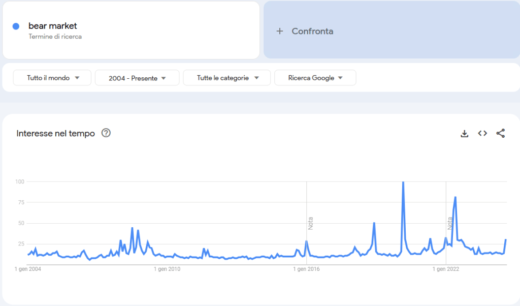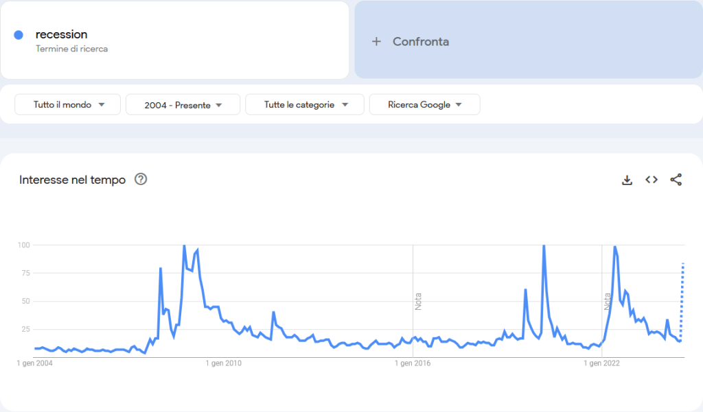 Paura di recessione alle stelle Galleria Posted on 06/08/2024 by Paolo Calcinari Ansidei Aumento dalla scorsa settimana delle ricerche Google relative a “recession” +1.567%, quelle relative a “bear market” +426%. Condividi: Email a link to a friend (Si apre in una nuova finestra) E-mail Stampa (Si apre in una nuova finestra) Stampa Condividi su Facebook (Si apre in una nuova finestra) Facebook Share on LinkedIn (Si apre in una nuova finestra) LinkedIn Condividi su X (Si apre in una nuova finestra) X Condividi su WhatsApp (Si apre in una nuova finestra) WhatsApp Condividi su X (Si apre in una nuova finestra) X Condividi su Tumblr (Si apre in una nuova finestra) Tumblr Condividi su Telegram (Si apre in una nuova finestra) Telegram Share on Pinterest (Si apre in una nuova finestra) Pinterest Mi piace Caricamento... Correlati