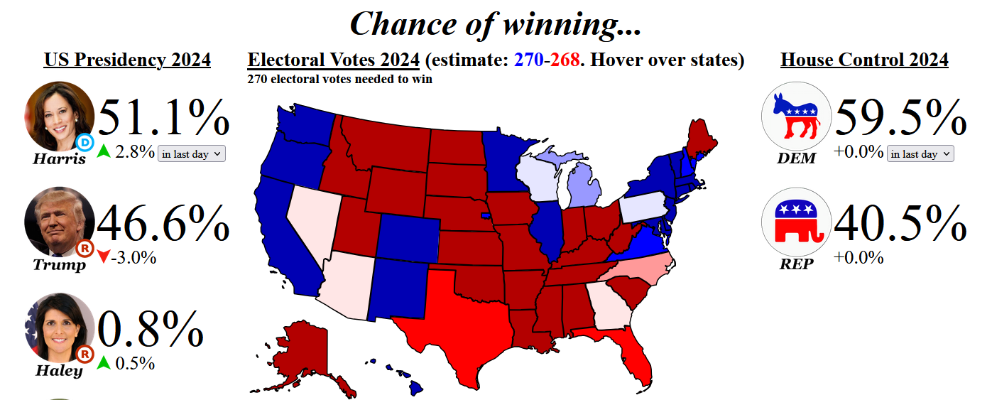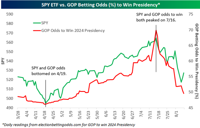 Ecco uno sguardo all’ETF S&P 500 rispetto alle quote giornaliere di scommesse sul partito repubblicano per vincere la presidenza secondo https://lnkd.in/dqyrTiDq. Entrambi hanno raggiunto i minimi più recenti il 19/4 ed entrambi hanno raggiunto i massimi più recenti il 16/7. Le quote del partito repubblicano sono appena scese sotto il 50% per la prima volta dal 22/5. – Here’s a look at the S&P 500 ETF versus daily readings for GOP betting odds to win the Presidency according to https://lnkd.in/dqyrTiDq. Both made most recent lows on 4/19 and both made most recent highs on 7/16. GOP odds just ticked below 50% for the 1st time since 5/22. Source: @beskopeinvest