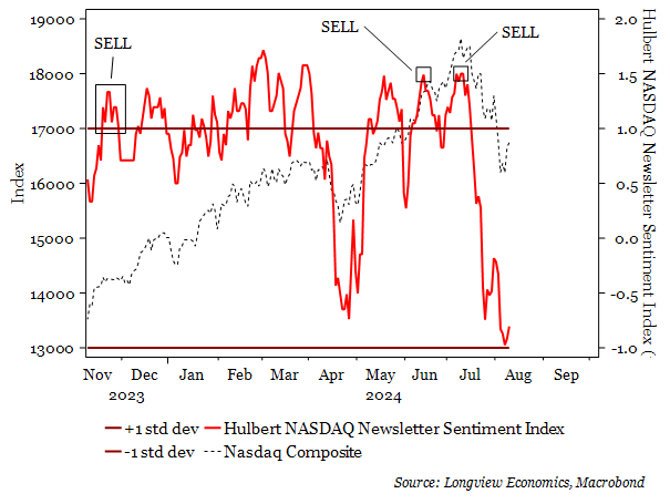 Dopo essere stati molto rialzisti (sui massimi) i redattori di newsletter finanziarie Usa consigliano ora una esposizione ribassista sul Nasdaq, sotto i livelli di aprile (minimo del mercato). Nasdaq 100 vs Hulbert Nasdaq Newsletter Sentiment Index (Average stock exposure recommended by financial newsletters). Now short!