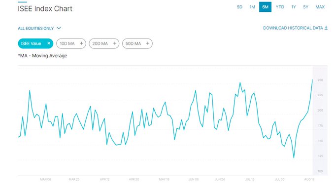 Tutti a comprare opzioni call (sulle azioni). Ise Equity call/put a 2,57 (cioè 2,57 call (rialzo) per 1 put (ribasso). – ISE Equity call/put ratio 2.57.