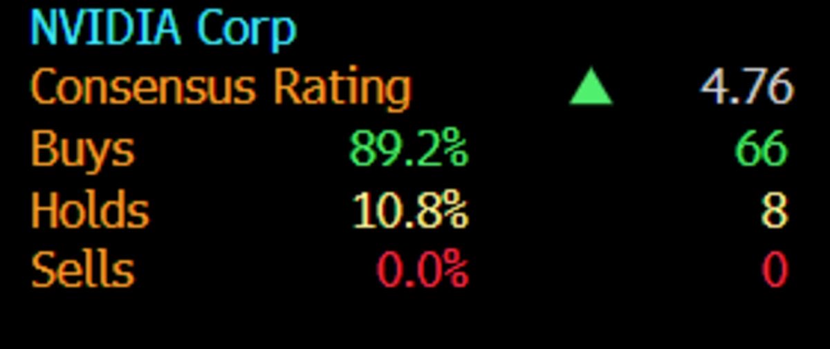 C’è trepidante attesa per gli utili di Nvidia, che saranno comunicati dopo la chiusura dei mercati questa sera. La tabella di Bloomberg mostra tra gli analisti che coprono il titolo nessuno ne consiglia la vendita, il resto ne consiglia l’acquisto (89,2%) o il mantenimento. Tutti dalla stessa parte della barca. – Nvidia Consensus rating. All on one side of the boat.