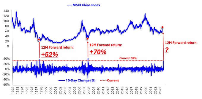 L’indice Msci Cina ha registrato il 3° maggior rialzo in 10 giorni di sempre. Nei due casi precedenti (15/9/98 e 10/11/08) a 12 mesi il risultato è stato poi: +52% e +70%. – China just registered its 3rd largest 10 day change ever. 12M forward returns from other two instances: – 9/15/1998: +52% – 11/10/2008: +70%