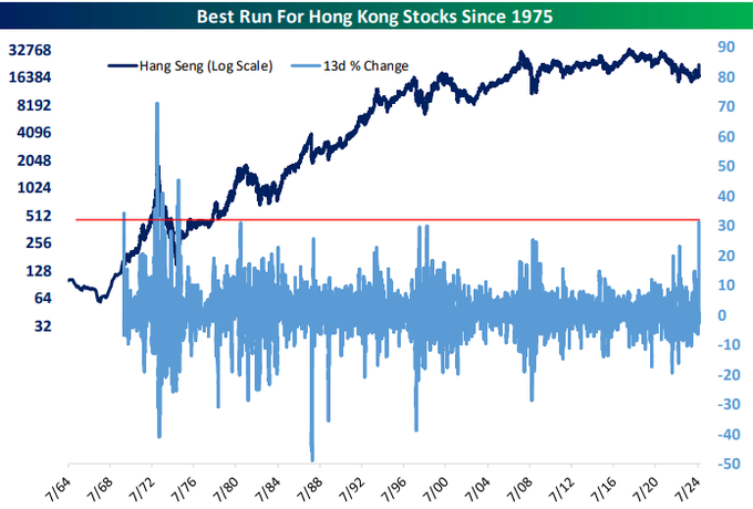 Rialzo record per l’indice della borsa di Hong Kong Galleria Posted on 02/10/2024 by Paolo Calcinari Ansidei L’indice Hang Seng della borsa di HK ha registrato in 13 giorni uno dei maggiori rialzi dal 1975. – Hong Kong (Hang Seng) 13-day gain of 31.2% is its strongest gain over that time frame since 1975. Condividi: Email a link to a friend (Si apre in una nuova finestra) E-mail Stampa (Si apre in una nuova finestra) Stampa Condividi su Facebook (Si apre in una nuova finestra) Facebook Share on LinkedIn (Si apre in una nuova finestra) LinkedIn Condividi su X (Si apre in una nuova finestra) X Condividi su WhatsApp (Si apre in una nuova finestra) WhatsApp Condividi su X (Si apre in una nuova finestra) X Condividi su Tumblr (Si apre in una nuova finestra) Tumblr Condividi su Telegram (Si apre in una nuova finestra) Telegram Share on Pinterest (Si apre in una nuova finestra) Pinterest Mi piace Caricamento... Correlati