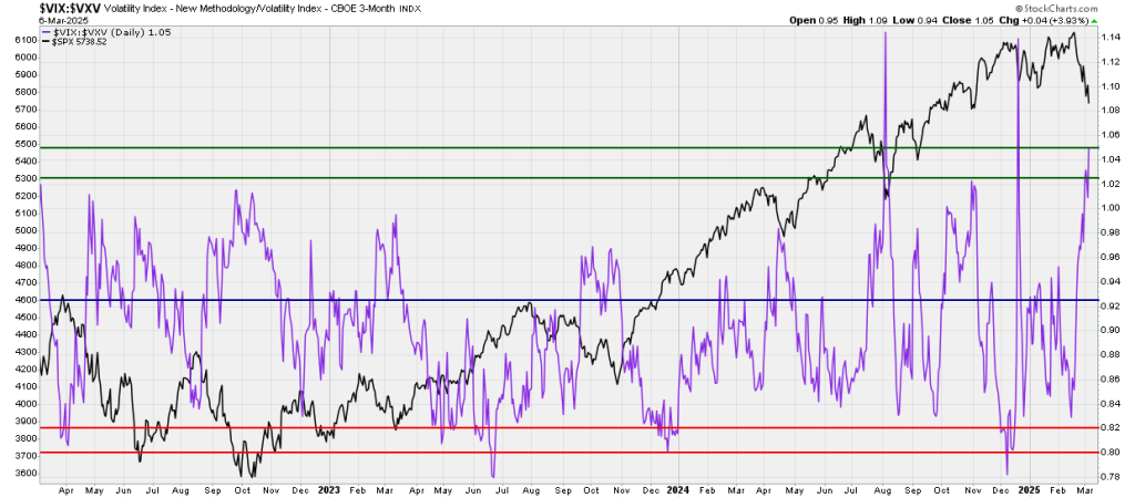 Il ratio Vix/Vxv, rapporto tra la volatilità attuale e quella stimata a 3 mesi ha superato 1, significa che la volatilità di questi giorni è superiore a quella a 3 mesi. Nel passato ha segnalato un minimo dell’S&P 500. – The Vix/Vxv ratio, which compares current volatility to the estimated volatility in 3 months, has exceeded 1. This means that the volatility of these days is higher than the volatility in 3 months. In the past, it has signaled a low in the S&P 500.