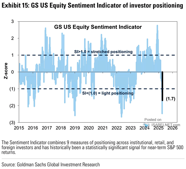 L’indicatore sul sentiment elaborato da GS attualmente si trova a -1,7 indicando una potenzionale occasione d’acquisto contrarian. – Goldman Sachs’ US Equity Sentiment Indicator currently stands at -1.7, signaling a potential contrarian buying opportunity.