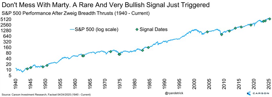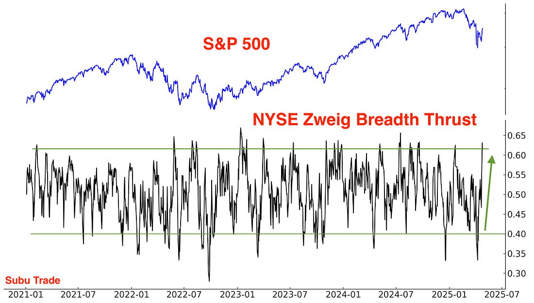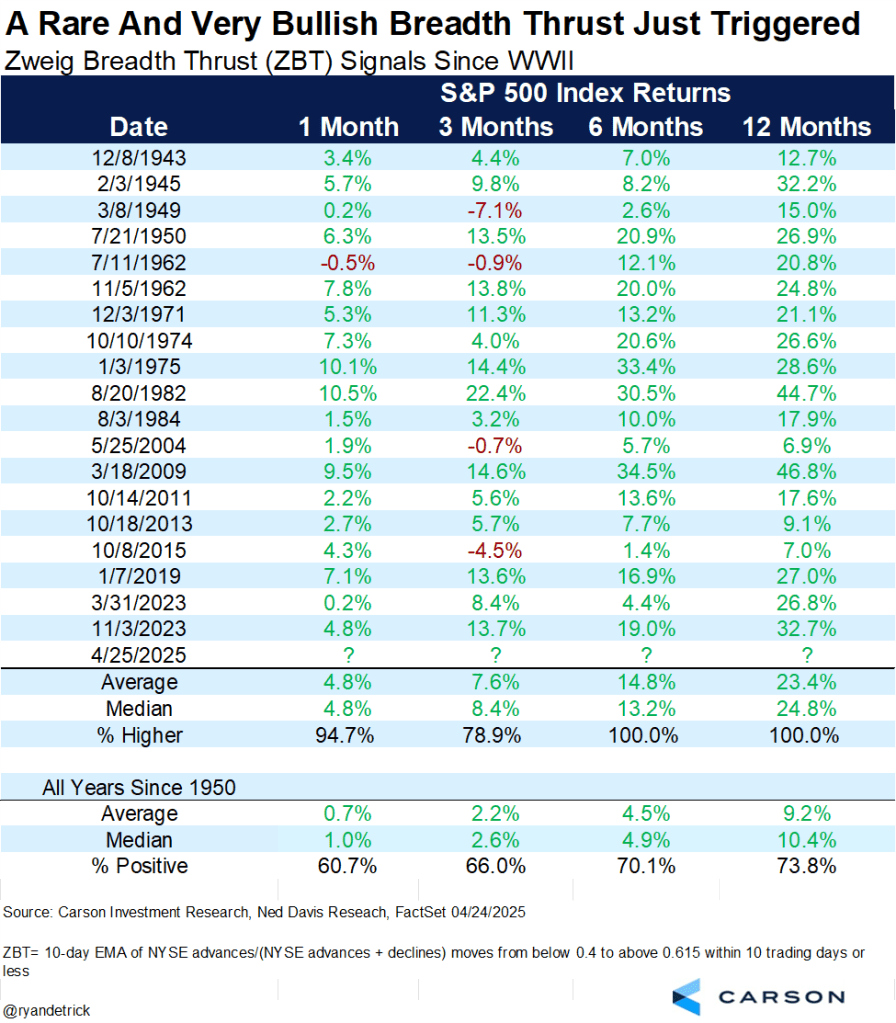 Venerdi si è attivato il raro Zweig Breadth Thrust (ZBT). Questo segnale ha un track record perfetto. Questo segnale è stato accurato al 100% fin dalla 2° guerra mondiale, con l’indice S&P 500 in rialzo 6 e 12 mesi dopo ogni singola volta. 19 su 19. – The rare Zweig Breadth Thrust (ZBT) triggered friday. This signal has a perfect track record. This signal has been 100% accurate since WWII, with the S&P 500 higher 6- and 12-months later every single time. 19 for 19.