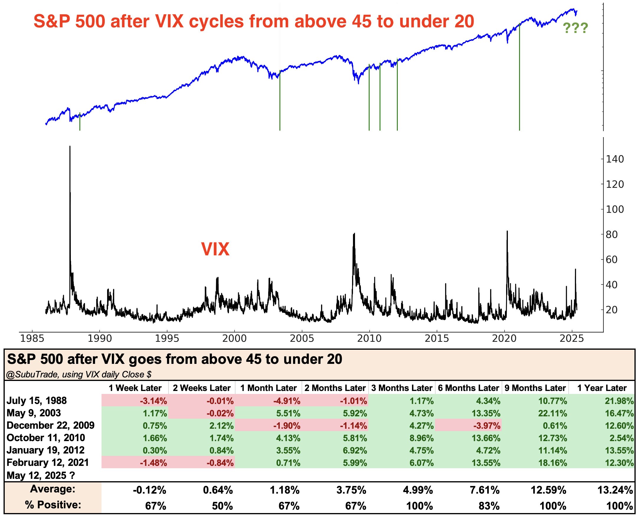 Ieri il Vix ha chiuso sotto 20, dopo essere stato sopra 45 un mese fa. Questo è quello che ha fatto l’S&P 500 dopo un simile segnale. – VIX closed below 20 yesterday, after being above 45 a month ago. Here’s what the S&P 500 did after similar setups.