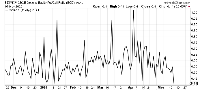 Speculazione rialzista un pò estrema ora. Galleria Posted on 15/05/2025 by Paolo Calcinari Ansidei Rapporto tra volume sulle opzioni put (ribassiste) e opzioni call (rialziste) sulle azioni a 0,41. Livello più basso da metà Gennaio. Attenzione ora a rincorrere il rialzo. – Equity put/call ratio 0.41. Lowest since mid January. Condividi: Email a link to a friend (Si apre in una nuova finestra) E-mail Stampa (Si apre in una nuova finestra) Stampa Condividi su Facebook (Si apre in una nuova finestra) Facebook Share on LinkedIn (Si apre in una nuova finestra) LinkedIn Condividi su X (Si apre in una nuova finestra) X Condividi su WhatsApp (Si apre in una nuova finestra) WhatsApp Condividi su X (Si apre in una nuova finestra) X Condividi su Tumblr (Si apre in una nuova finestra) Tumblr Condividi su Telegram (Si apre in una nuova finestra) Telegram Share on Pinterest (Si apre in una nuova finestra) Pinterest Mi piace Caricamento... Correlati