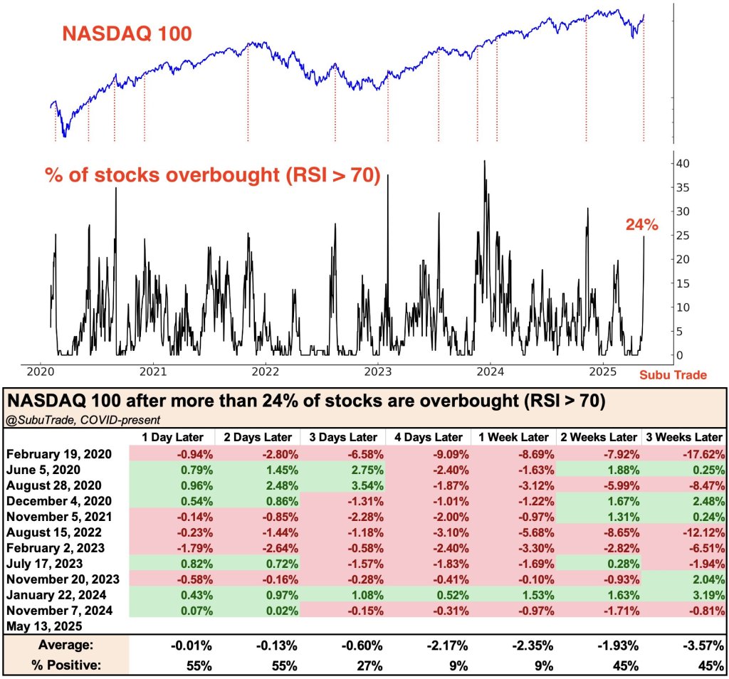 Più del 24% delle azioni nel Nasdaq 100 sono in ipercomprato (RSI sopra 70). Dalla pandemia questo ha portato a un calo dopo una settimana. – More than 24% of NASDAQ 100 stocks are overbought (RSI above 70). Since COVID, that’s led to a 1 week pullback.