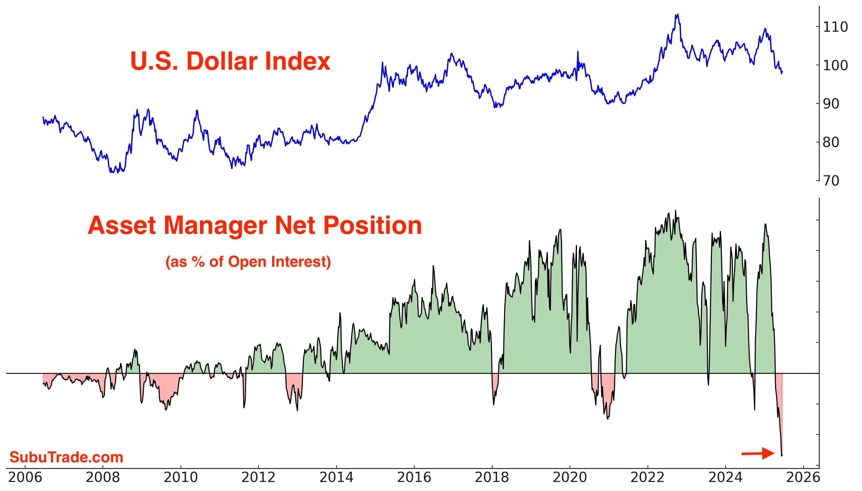 Record ribassista sul Dollaro Usa Galleria Posted on 24/06/2025 by Paolo Calcinari Ansidei Secondo il COT Report, i gestori di fondi sono molto ribassisti sul dollaro USA. Questo è un segnale rialzista per il dollaro? – Asset Managers are almost record short the U.S. Dollar, according to the COT Report. Is this bullish for the Dollar? Condividi: Email a link to a friend (Si apre in una nuova finestra) E-mail Stampa (Si apre in una nuova finestra) Stampa Condividi su Facebook (Si apre in una nuova finestra) Facebook Share on LinkedIn (Si apre in una nuova finestra) LinkedIn Condividi su X (Si apre in una nuova finestra) X Condividi su WhatsApp (Si apre in una nuova finestra) WhatsApp Condividi su X (Si apre in una nuova finestra) X Condividi su Tumblr (Si apre in una nuova finestra) Tumblr Condividi su Telegram (Si apre in una nuova finestra) Telegram Share on Pinterest (Si apre in una nuova finestra) Pinterest Mi piace Caricamento... Correlati