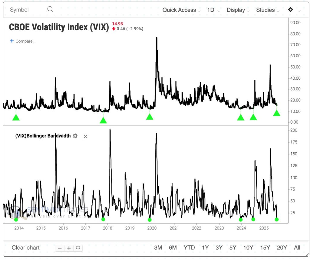 Dalla fine della crisi finanziaria globale, le Bande di Bollinger del VIX hanno subito una forte compressione altre 5 volte. Nei successivi 4 mesi, il VIX è balzato di oltre il 50% ogni volta. Non bene per l’azionario di conseguenza. – Since the end of the global financial crisis, the VIX’s Bollinger Bands compressed this tightly 5 other times. Within the next 4 months, the VIX jumped by more than 50% every time. Source: Sentimentrader.com