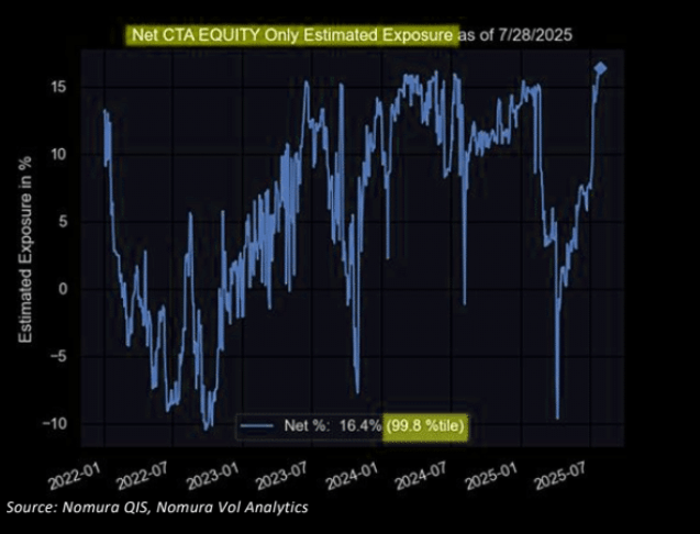 Fondi “trend followers” tutti rialzisti sull’azionario Galleria Posted on 30/07/2025 by Paolo Calcinari Ansidei Secondo Nomura l’esposizione all’azionario dei fondi CTA (trend followers) ha raggiunto il 100° percentile. – CTA positioning has now reached the 100th percentile according to Nomura Condividi: Email a link to a friend (Si apre in una nuova finestra) E-mail Stampa (Si apre in una nuova finestra) Stampa Condividi su Facebook (Si apre in una nuova finestra) Facebook Share on LinkedIn (Si apre in una nuova finestra) LinkedIn Condividi su X (Si apre in una nuova finestra) X Condividi su WhatsApp (Si apre in una nuova finestra) WhatsApp Condividi su X (Si apre in una nuova finestra) X Condividi su Tumblr (Si apre in una nuova finestra) Tumblr Condividi su Telegram (Si apre in una nuova finestra) Telegram Share on Pinterest (Si apre in una nuova finestra) Pinterest Mi piace Caricamento... Correlati