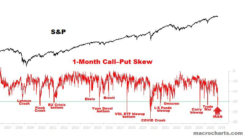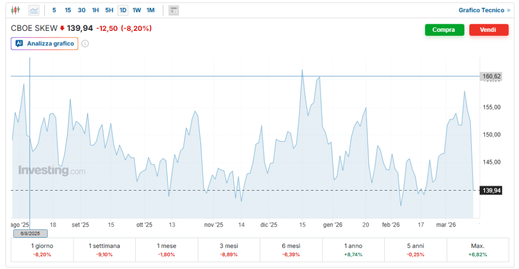 Mercoledi il costo di protezione da eventi estremi del mercato azionario Usa, misurato dalla differenza dello Skew (volatilità delle opzioni OTM) tra Call e Put si era avvicinato a livelli storici elevati. Ieri lo Skew è crollato segno che i traders sulle opzioni non si aspettano, per ora, eventi estremi. – The cost of protection is near the most expensive levels in history. Time to Buy?