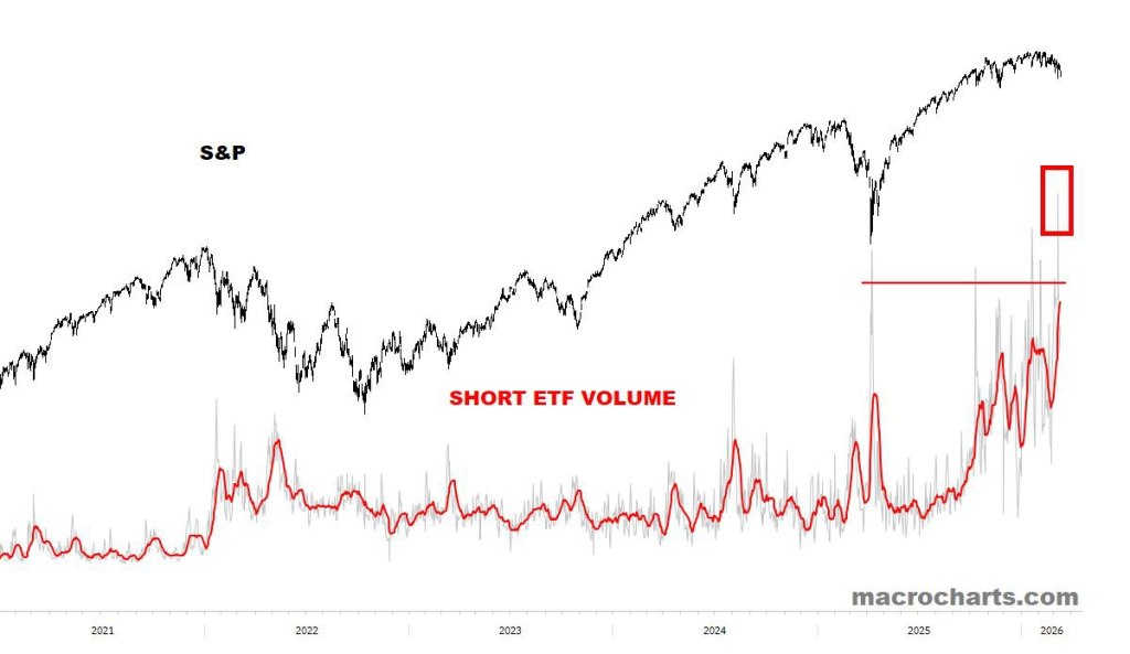 Scorsa settimana: 1) volumi record su etf ribassisti sugli indici Usa, superiori a quelli registrati sui minimi di aprile 25. 2) Secondo il prime book di Goldman Sachs vi è stato in un giorno il maggior aumento di acquisti su etf ribassisti. 3) I gestori di fondi hanno venduto quantità record di future sull’indice S&P500, superiore rispetto al crollo COVID. – Last week: 1) Bearish ETF volume on US indices hit record levels, exceeding those seen at the April 2025 lows. 2) According to Goldman Sachs’ prime brokerage book, there was the largest one-day increase in buying of bearish ETFs. 3) Fund managers sold a record amount of S&P 500 index futures, greater than during the COVID crash. Time to Buy?
