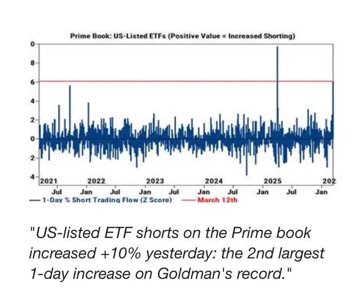 Scorsa settimana: 1) volumi record su etf ribassisti sugli indici Usa, superiori a quelli registrati sui minimi di aprile 25. 2) Secondo il prime book di Goldman Sachs vi è stato in un giorno il maggior aumento di acquisti su etf ribassisti. 3) I gestori di fondi hanno venduto quantità record di future sull’indice S&P500, superiore rispetto al crollo COVID. – Last week: 1) Bearish ETF volume on US indices hit record levels, exceeding those seen at the April 2025 lows. 2) According to Goldman Sachs’ prime brokerage book, there was the largest one-day increase in buying of bearish ETFs. 3) Fund managers sold a record amount of S&P 500 index futures, greater than during the COVID crash. Time to Buy?