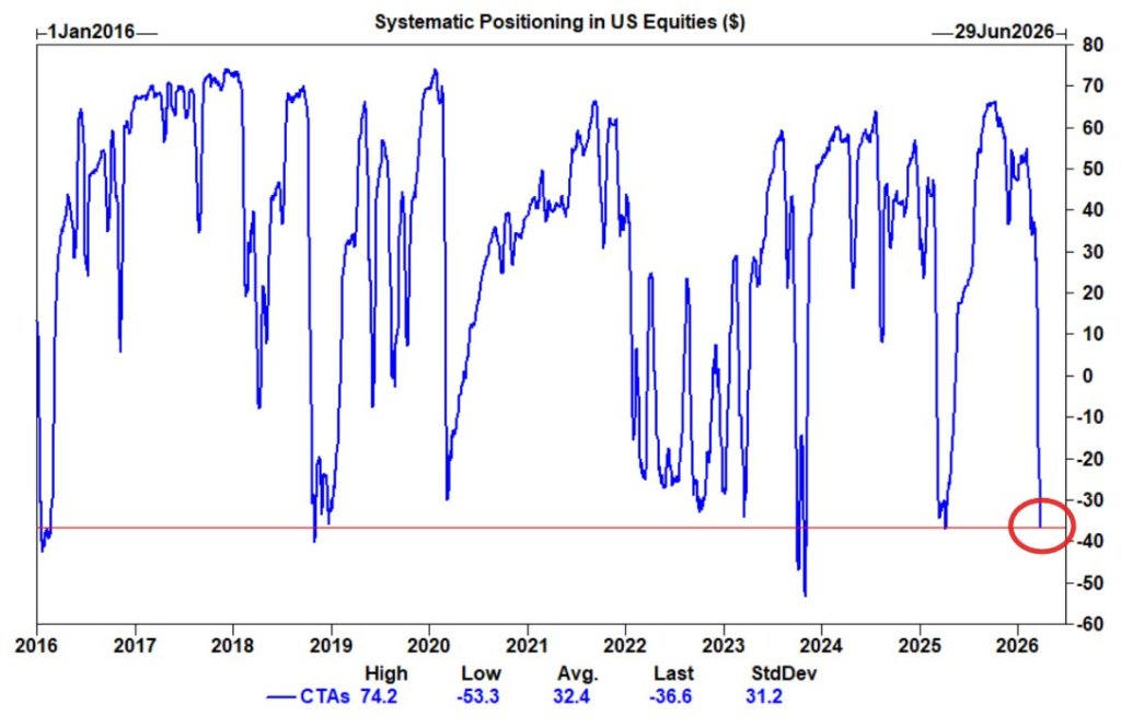 GS: Le posizione sistematiche si sta avvicinando a livelli di esaurimento. Le nostre stime sui CTA indicano che la posizione è diventata nettamente ribassista sulle azioni Usa, una situazione che storicamente si è associata a un’evoluzione dei prezzi più favorevole nell’immediato. – Goldman Sachs (Coppersmith): Systematic positioning is now approaching washed-out levels. Our CTA estimates show positioning has flipped to outright short in US equities, which has historically been associated with more supportive near-term price action. Time to BUY?