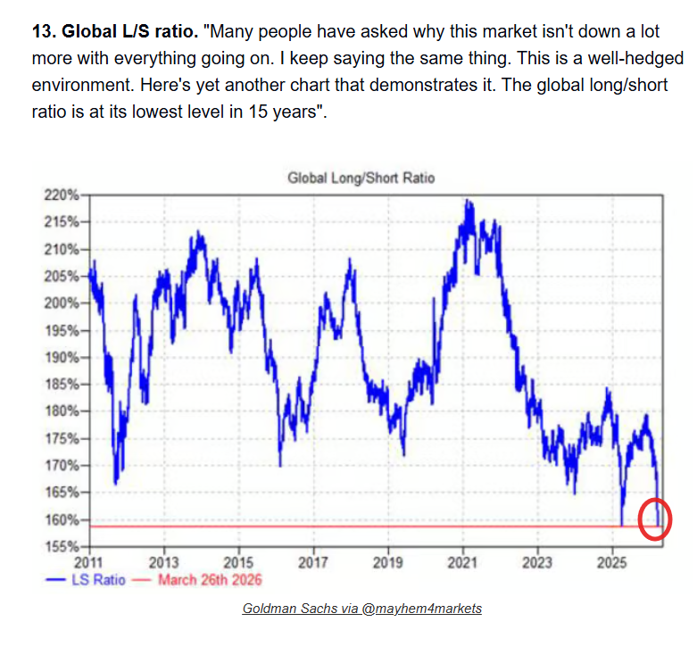 Tutti si sono coperti dal ribasso Galleria Posted on 31/03/2026 by Paolo Calcinari Ansidei Perché questo mercato non è sceso molto di più con tutto quello che sta succedendo? Perchè tutti sono coperti. Il rapporto globale long/short è al livello più basso degli ultimi 15 anni. Time to BUY? Condividi: Invia un link a un amico via e-mail (Si apre in una nuova finestra) E-mail Stampa (Si apre in una nuova finestra) Stampa Condividi su Facebook (Si apre in una nuova finestra) Facebook Condividi su LinkedIn (Si apre in una nuova finestra) LinkedIn Condividi su X (Si apre in una nuova finestra) X Condividi su WhatsApp (Si apre in una nuova finestra) WhatsApp Condividi su X (Si apre in una nuova finestra) X Condividi su Tumblr (Si apre in una nuova finestra) Tumblr Condividi su Telegram (Si apre in una nuova finestra) Telegram Condividi su Pinterest (Si apre in una nuova finestra) Pinterest Mi piace Caricamento... Correlati